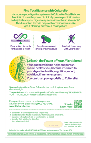 Culturelle® Total Balance works differently to help ease occasional constipation because it is not just another fiber filler. It uses the power of probiotics to help keep you regular.* Containing a unique blend of 3 clinically studied probiotic strains with a total of 11 Billion CFUs, one small capsule a day will help relieve occasional digestive issues like diarrhea, constipation, bloating and gas.* These ingredients work naturally with your body, giving you the balance, and relief, you want.*