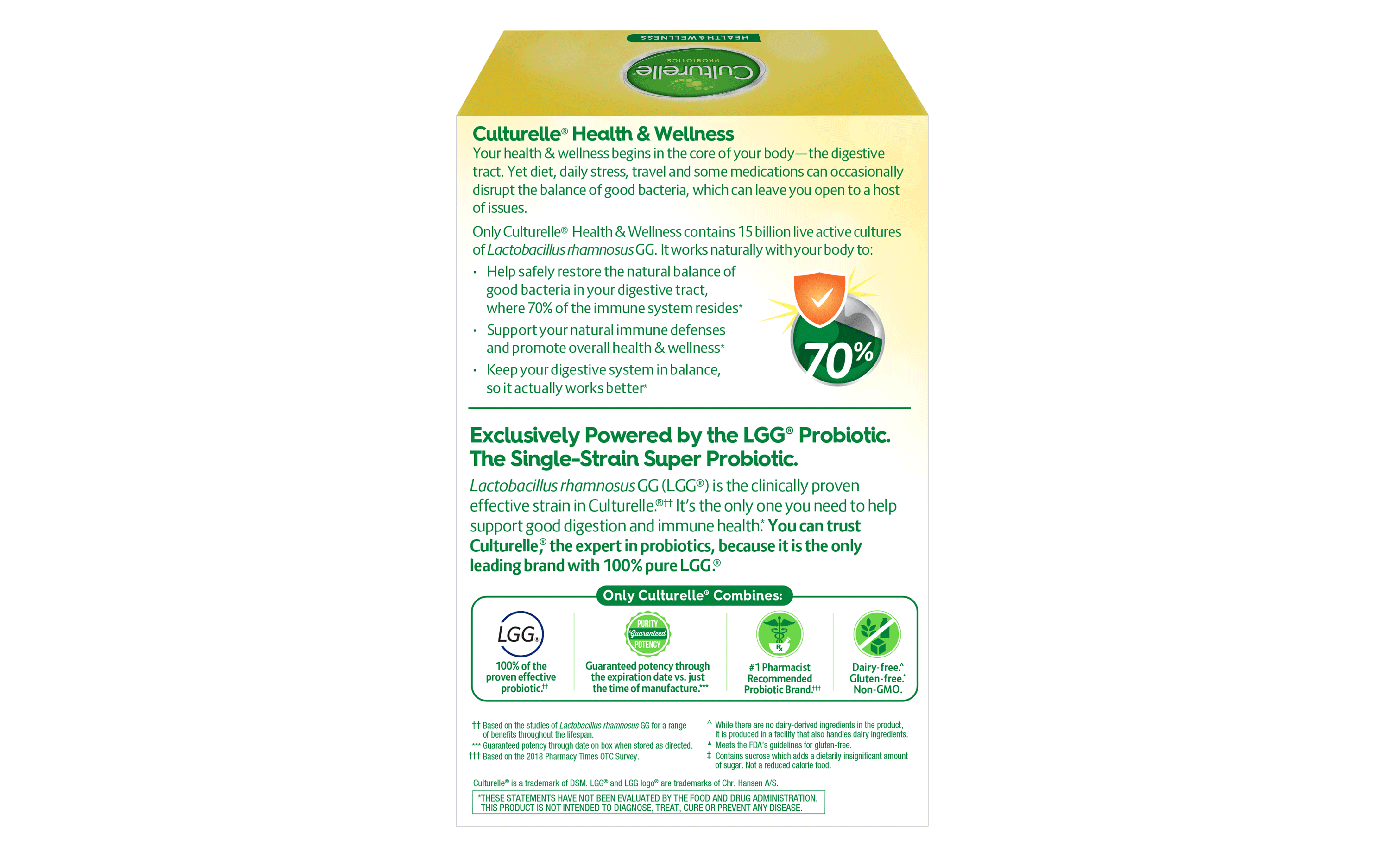 Culturelle® Health & Wellness offers all of the immune system benefits of the #1 clinically studied probiotic strain,†† Lactobacillus rhamnosus GG (LGG®), in a plant-based, vegetarian formula.*