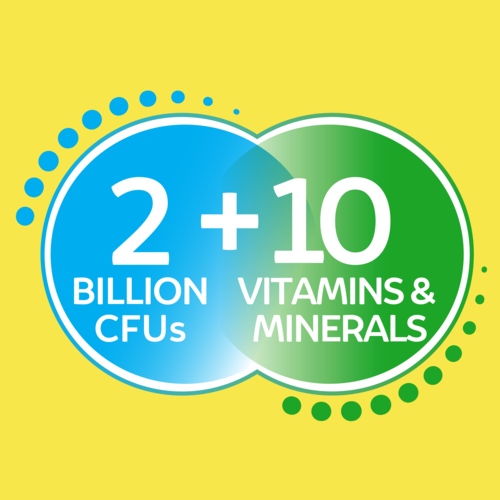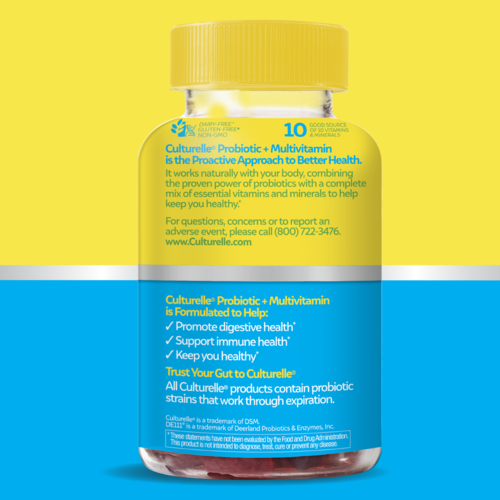 The delicious & easy way to take a probiotic + multivitamin Introduce your taste buds to delicious berry probiotic + multivitamin gummies! Formulated with a new strains for Culturelle®, plus a combination of 10 vitamins and minerals, taking your vitamins and probiotics has never been easier. We have crafted a gummy that includes 2 billion CFUs of good bacteria. With less than 1g of sugar per serving, fruit pectin instead of gelatin so they are vegan-friendly, and no sugary coating; they are a gummy you can feel good about taking each day!